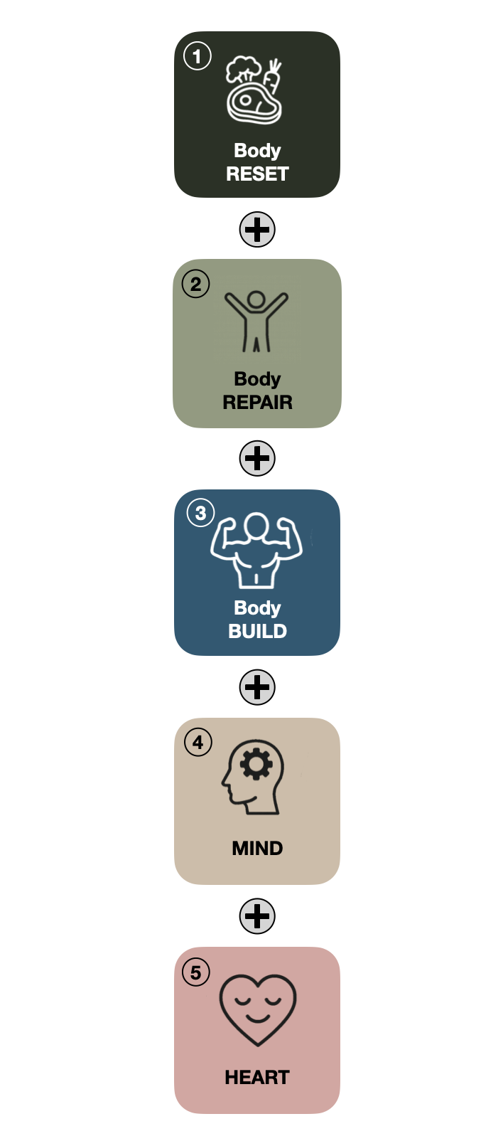 Dessa 5 fristående steg ger dig förutsättningar för ett friskare, vitalare och längre liv. Ta dig an dessa delar genom våra attraktiva tjänster i valfri ordning, men för att säkerställa största möjliga hälsovinster så rekommenderar vi dem i ovan ordningsföljd.